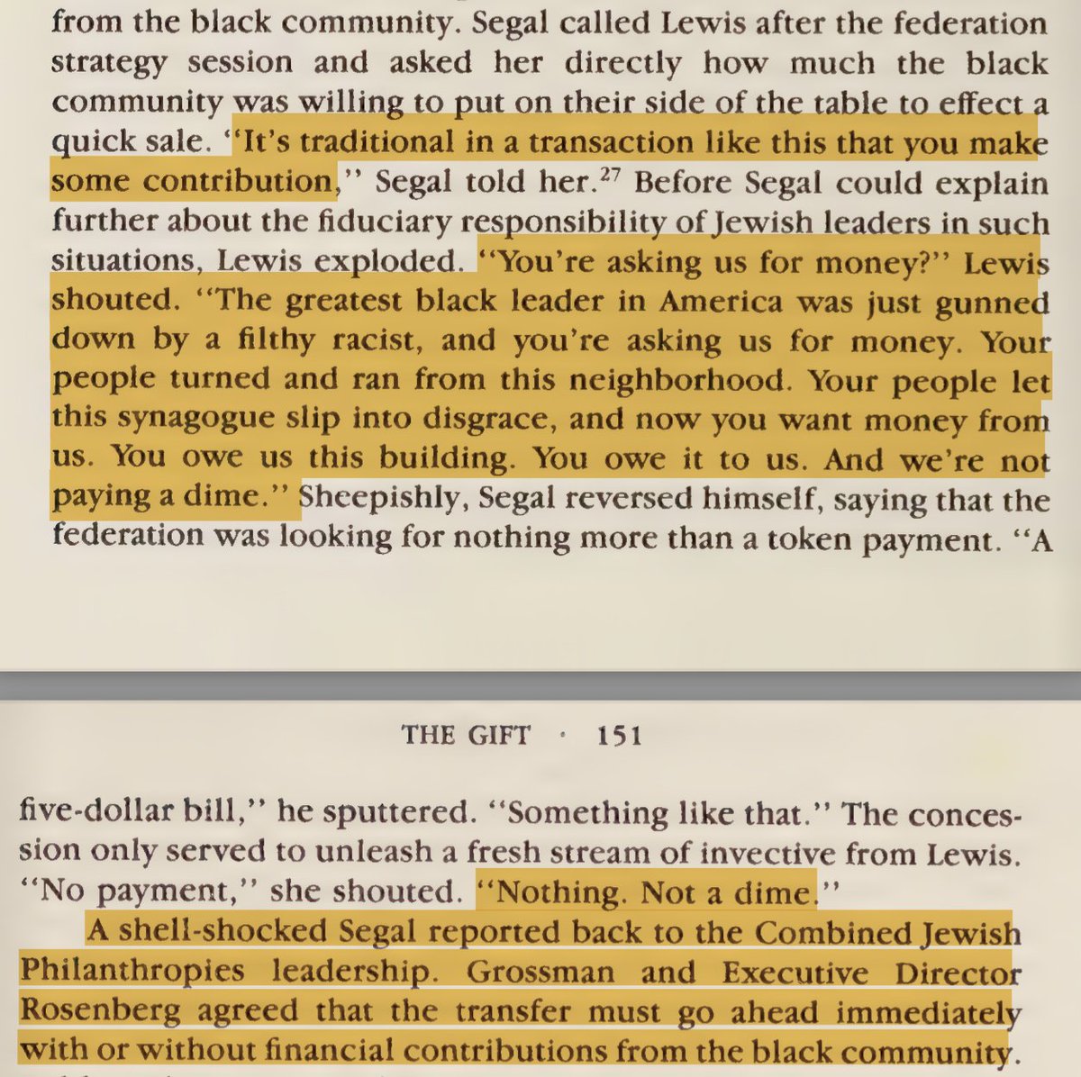 Jewish leaders suggested Lewis try fund-raising in the Black community to help with the purchase of the temple. The timing was awkward, as Black militants were now calling for reparations from Jews to Blacks. Jews were shocked by hits development.