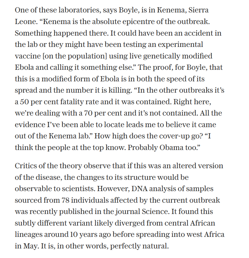 They weren't the first to suspect a lab leak. International law expert Francis Boyle (who had helped implement the Bioweapons Convention in the US) was at the time the leading proponent of a theory that a lab in Kenema, Sierra Leone, with ties to USAMRIID, was responsible.