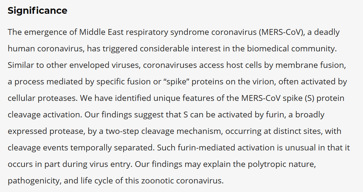 With the advent of MERS in late 2012 interest in proteolytic cleavage grew. MERS' S1/S2 junction has a motif that can be cleaved by furin, and so does another site in S2. (Note that both of these have a minimal R-X-X-R motif, not the canonical R-X-[K/R]-R.)