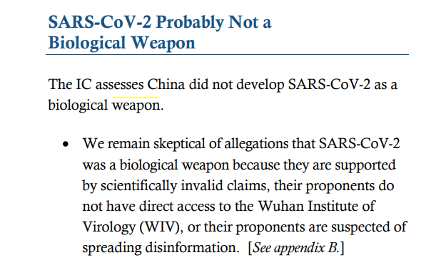 The US IC have rejected a bioweapon origin according to ODNI. But they don't seem to have investigated independently. The ODNI report only references a vitriolic public exchange between intransigent zoonosis proponents, and a dissident scientist who fled HK early in the pandemic.