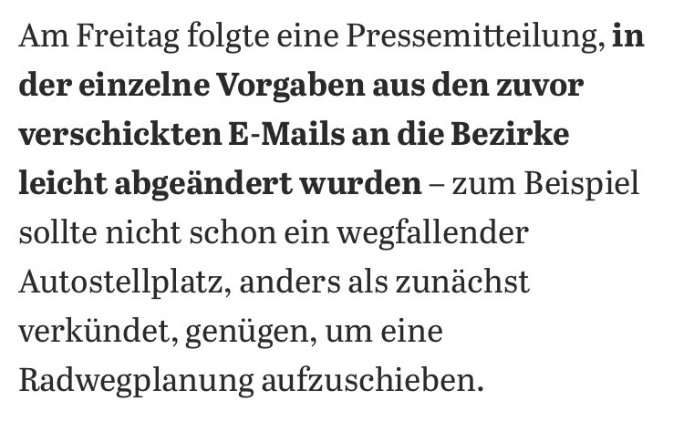 Die ganze Misere begann am 15. Juni mit dem bekanntwerden einer Mail an einige Bezirke, laut der alle laufenden #Radwege-Planungen gestoppt werden sollten, bei denen auch nur ein einziger Parkplatz oder Fahrstreifen umgewandelt würde. Die Empörung war zurecht riesig.