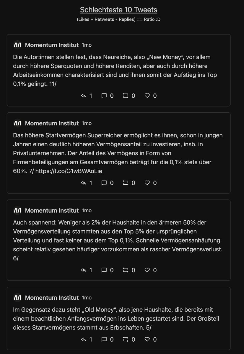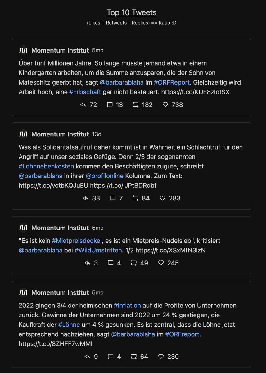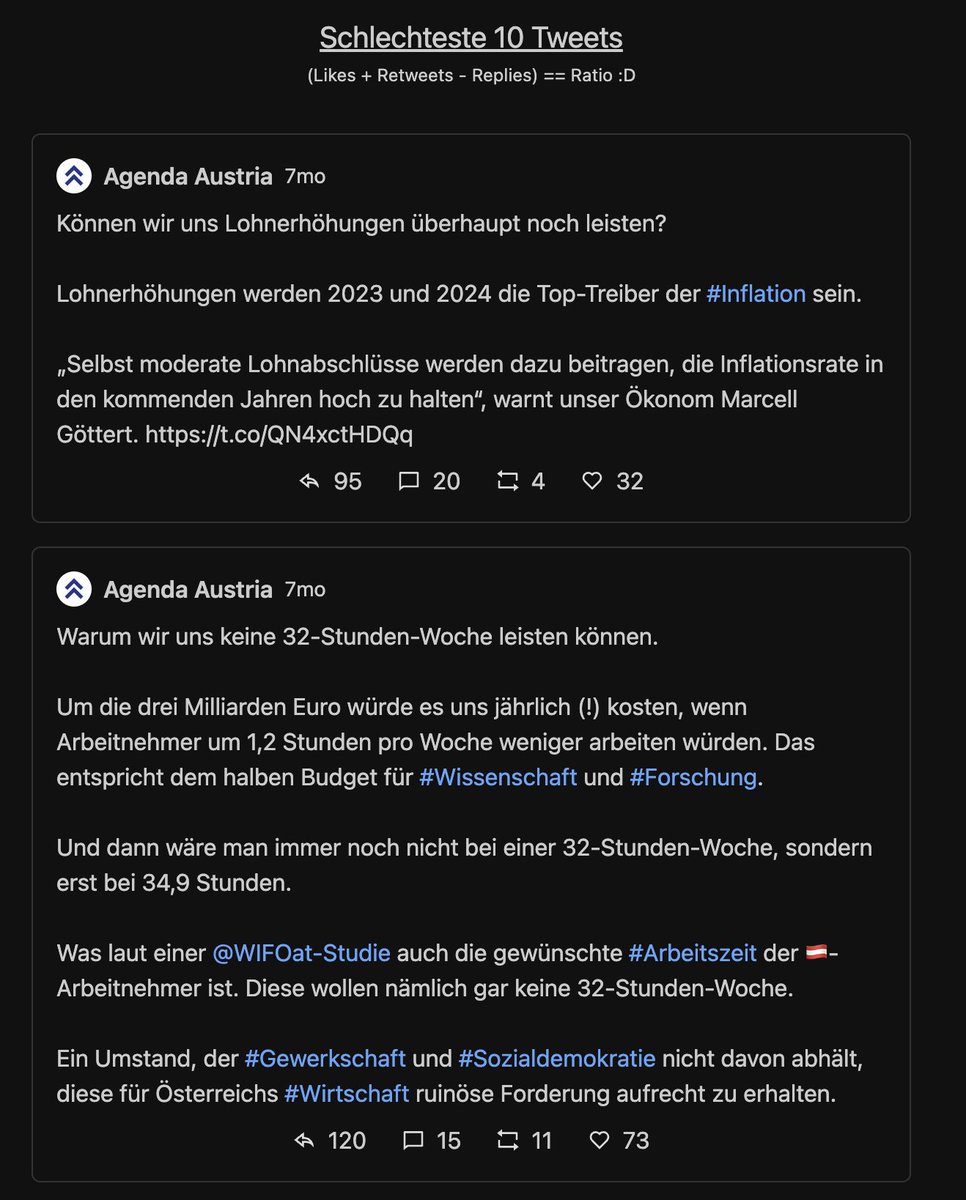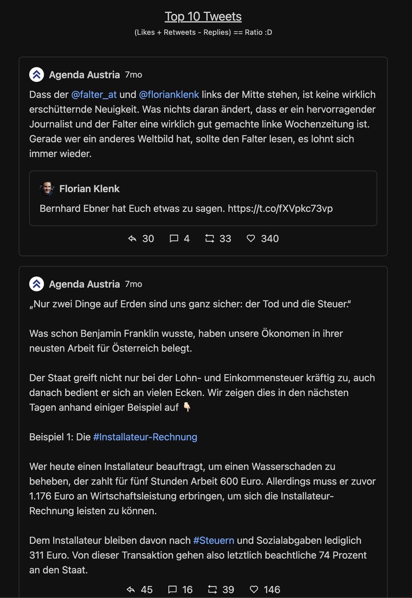 Next, die top Tweets. Jeder Tweet kriegt eine Wertung = Likes+Retweets-Replies = Ratio.