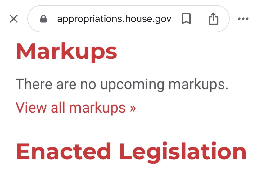 7) The Appropriations Committee has itself been unable to pass 2 of the 12 bills (CJS and Labor-H). There are at present “no upcoming markups” scheduled to move them to the floor.