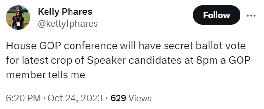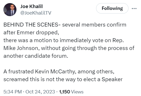 Before we move to the next phase, I'd like to circle back to a thing that happened late last night: during Republicans' second attempt of the day to find a speaker nominee, they uncovered what looked awfully like a plot to deny Mike Johnson the nomination and reinstate McCarthy--