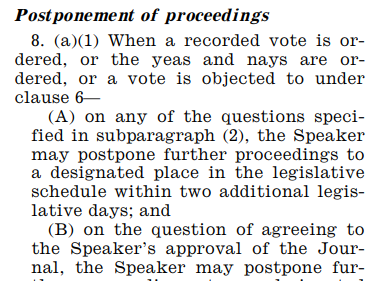Procedural. Last night's vote failed 215-215. Blake Moore changed his vote so he could seek reconsideration of the resolution, which he then did. His request for a recorded vote on a motion to reconsider was postponed (by Speaker Johnson), under Rule XX