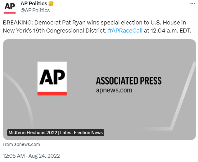 Pat Ryan won a close special election in NY in 2022. AP called his race just after midnight on the night of the 8/23/22 special; the Clerk was officially notified of his election 10 days later, 9/2/22. The House was in recess so he was sworn in the night they returned, 9/13/22.