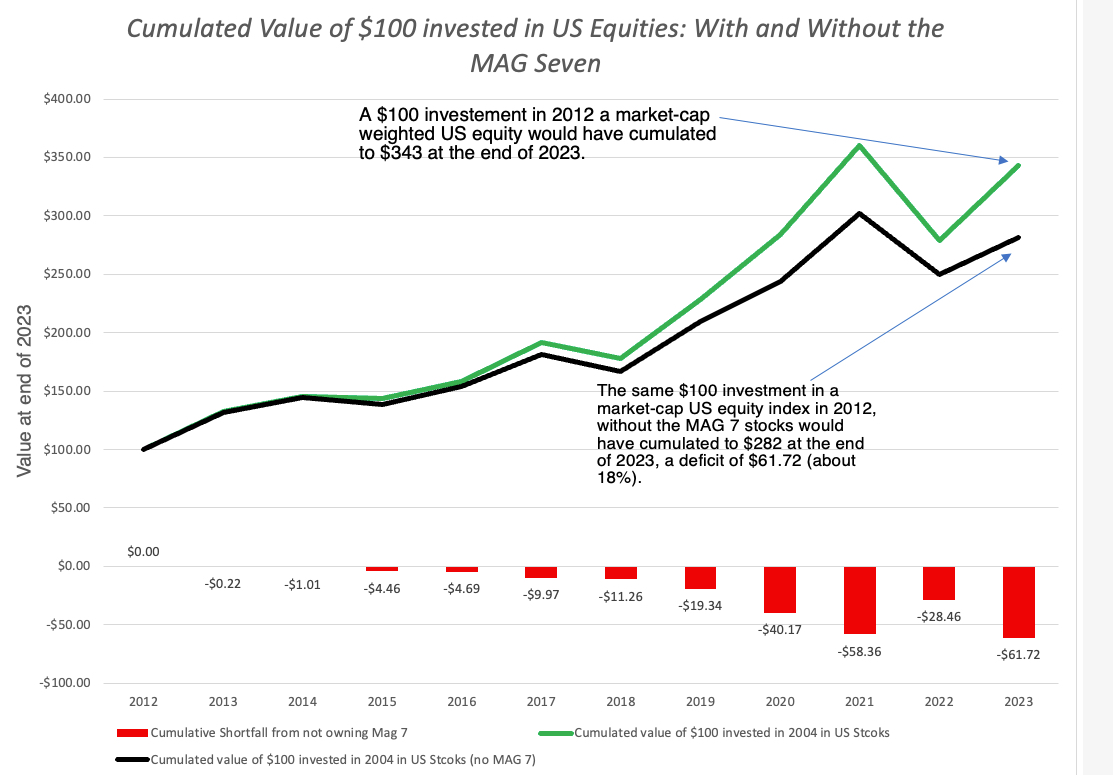 A US stock portfolio created in Dec 2012 without the Mag Seven stocks in it, would have had a shortfall of about 18% in cumulated value by the end of 2023, relative to a portfolio with these stocks. Small stock and value investors suffered! bit.ly/4bsNEcB