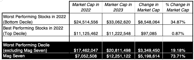 One explanation for the Mag Seven performance in 2023 is that it represented a recovery from a catastrophic 2022, when these seven stocks lost $4 trillion in market value. But it is only partial, since they outperformed other 2022 losers. bit.ly/4bsNEcB