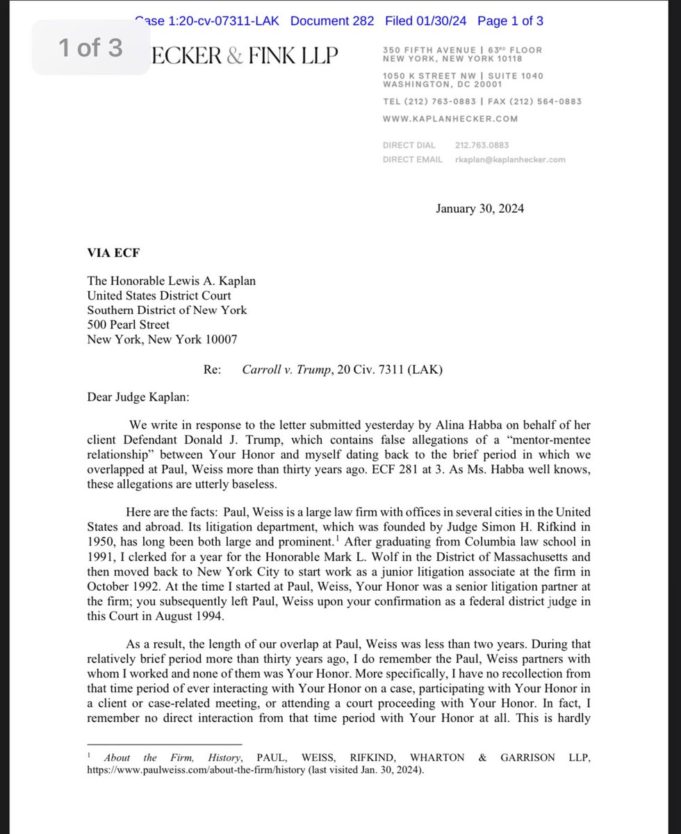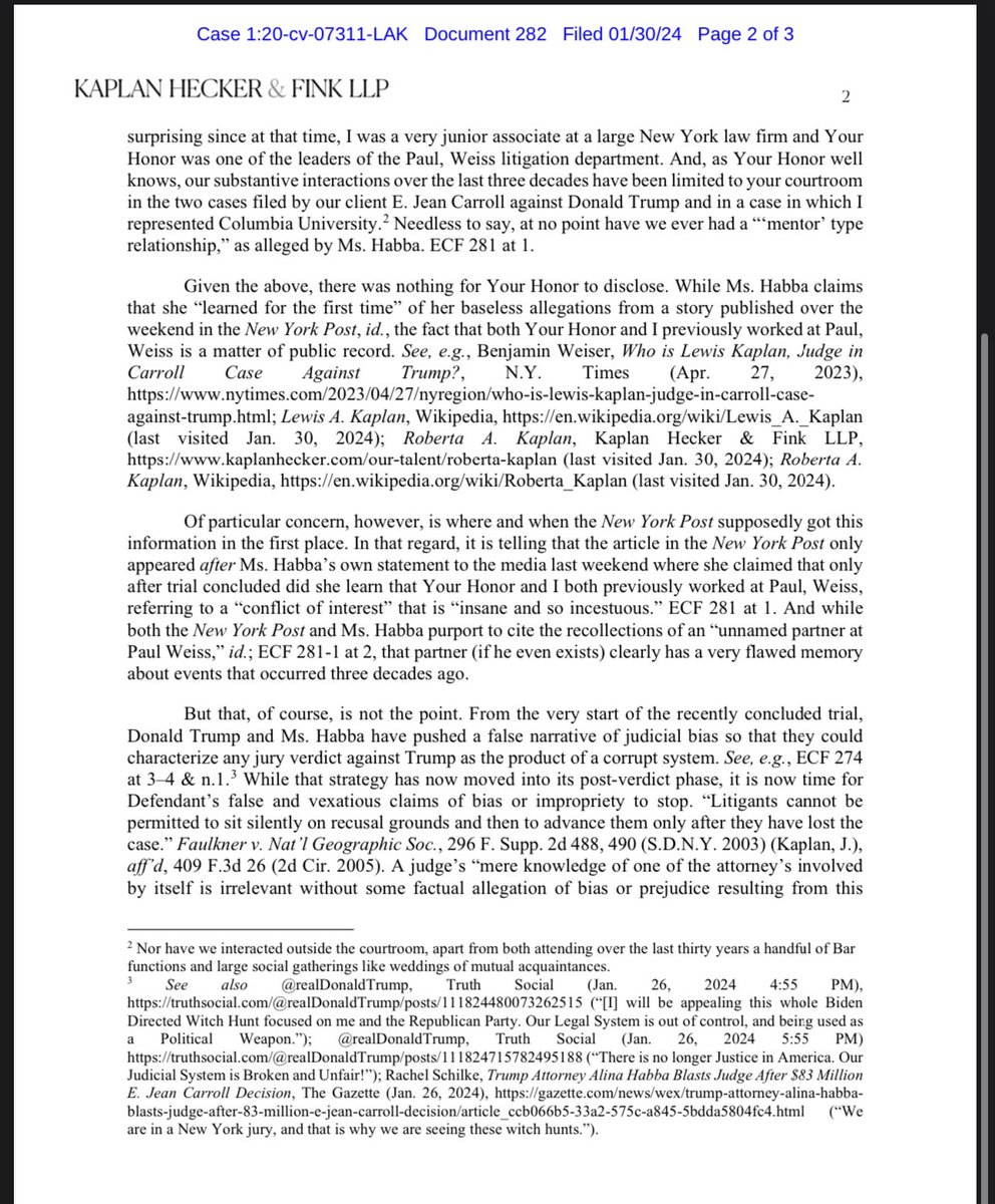 Habba alleged Roberta Kaplan and Judge Kaplan had a mentor-mentee relationship at a law firm they both worked for, and that the judge failed to disclose it. Problem is, it was over 30 years ago, at a massive firm, and the two never crossed paths. 2/