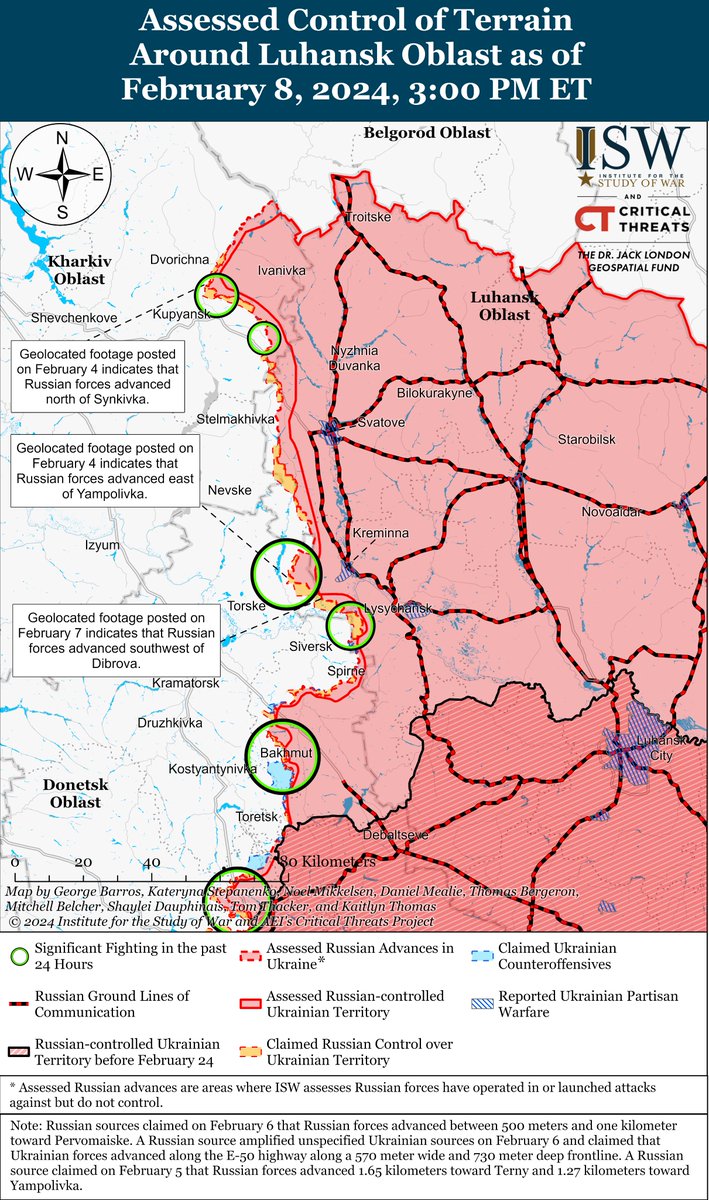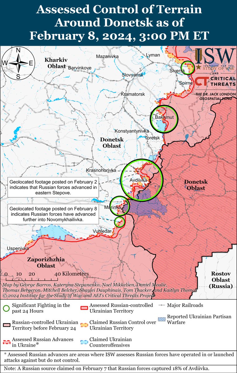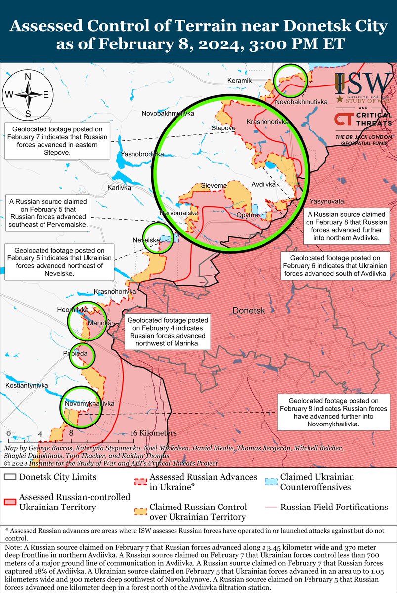 Ukrainian forces recently made confirmed advances near Kreminna and Russian forces recently made confirmed advances near Kreminna, Avdiivka, and Donetsk City amid continued positional fighting along the entire line of contact on February 8. (1/3)