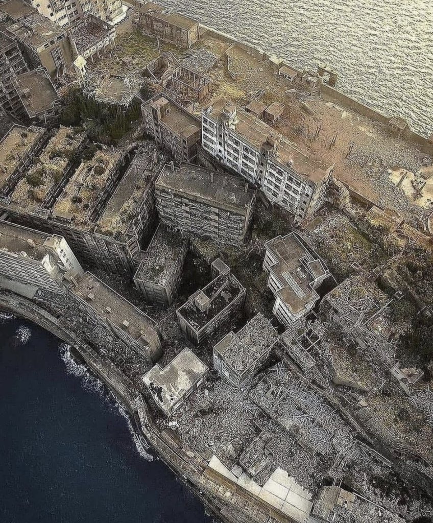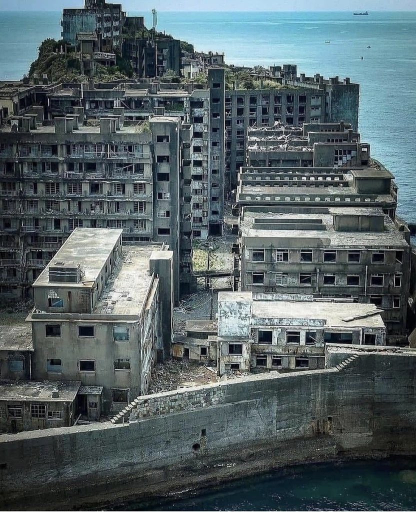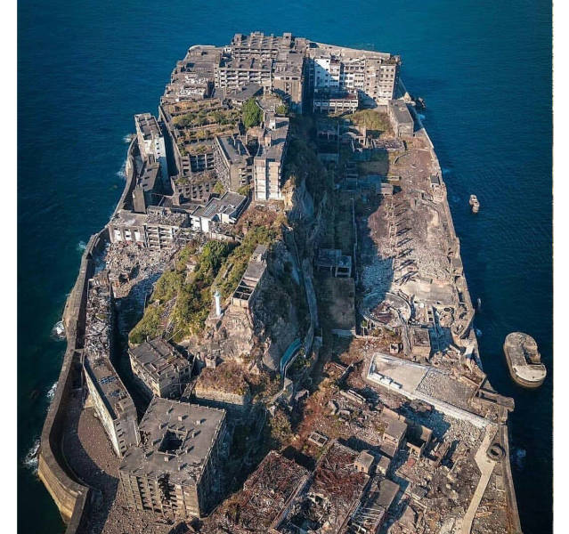 1. Esta diminuta isla se encuentra frente a la costa de Nagasaki. La isla está rodeada por una muralla marina parecida a una fortaleza y llena de edificios estrechamente apiñados.