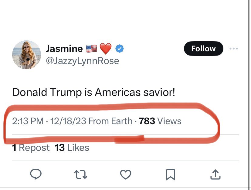 2) So I decided to check. Was 2/8/24 really the day she decided not to vote for Biden? No. Here’s a tweet from 12/18/23 saying Trump is America’s savior. Along with a lot of pro-Trump, anti-Democrat tweets between these two tweets. So who is this person?⬇️