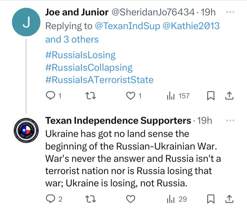 2) Here’s another blatantly pro-Russia post. Goes the extra mile trying to deny Russia is losing the war. Why would a Texan care? Again, the weird syntax. “Ukraine has got no land…” And denies Russia is a terrorist nation. Again, why would a Texan care? More⬇️