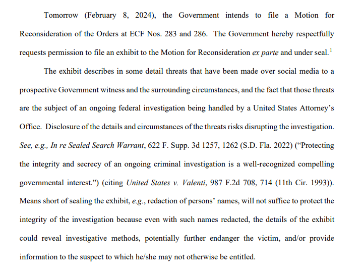 Specifically, the document -- in Smith's description -- "describes in some detail threats that have been made over social media to a prospective Government witness and the surrounding circumstances" & that "those threats are the subject of an ongoing federal investigation." 2/