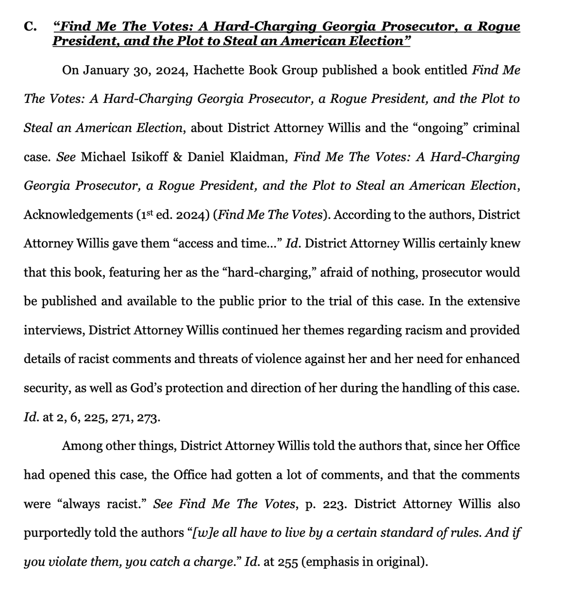 "District Attorney Willis certainly knew that this book, featuring her as the “hard-charging,” afraid of nothing, prosecutor would be published and available to the public prior to the trial of this case. In the extensive interviews, District Attorney Willis continued her themes regarding racism and provided details of racist comments and threats of violence against her and her need for enhanced security, as well as God’s protection and direction of her during the handling of this case"