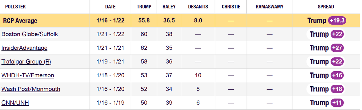 In altre parole, quasi tutto il voto dei candidati che si sono ritirati nell’ultima settimana (#DeSantis, #Ramaswamy ecc.) e che in New Hampshire raccoglievano poco più del 10%, è andato a lei.