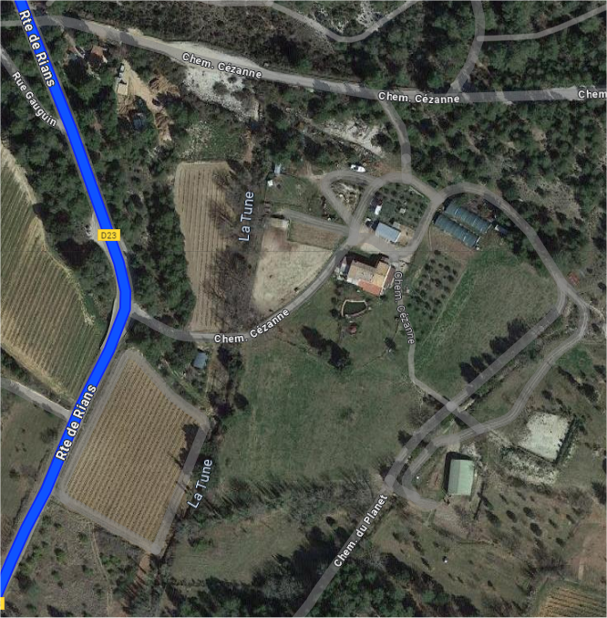 Le vaste domaine d'essais de drones à Pourrières est situé dans un endroit plutôt discret, difficile de voir ce qui s'y passe de la route, il y a un portail juste après le pont passant une rivière