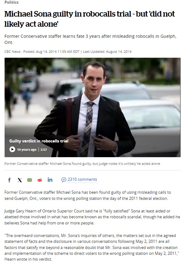 Michael Sona speaks out about robocalls, his suicide attempt, and recovery. Any investigation should have examined CPC Headquarters and use of the CIMS database.
