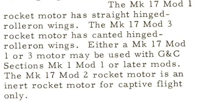 The rollerons were changed from horizontal hinge to angled hinge with Mk 17 Mod 3 and up. This was limited to usage with the Guidance and Control Sections Mk 1 Mod 1, or the 9B GCS.