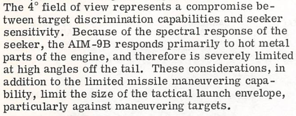 Furthermore, the narrower field of view of the 9E seeker(2.5 degrees compared to 4 of 9B), when coupled with the same painfully slow track rate of 12 deg/sec(same as 9B), may have contributed to a vast number of AIM-9Es missing their targets outright.
