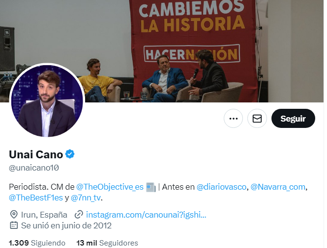 La segunda cuenta en seguir fue la del Voxtuber Infovloger, la tercera Unai Cano, ex 7NN, CM de The Objective que tiene de portada una foto en acto del grupo neonazi Hacer Nación y que ya colaboró con Alvise y Vito Quiles para ayudar a Rubiales con bulos. pandemiadigital.net/odio/conversac…