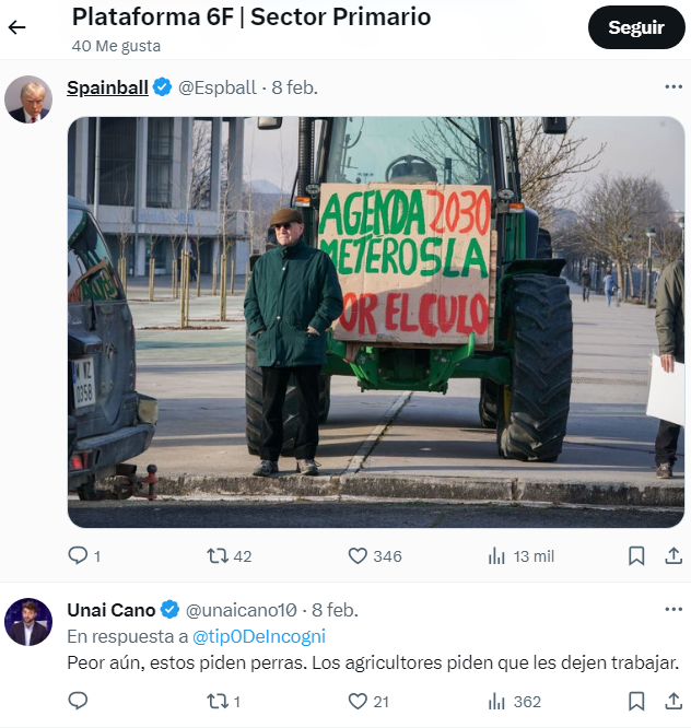 Lo más llamativo es que a continuación sigue a Españabola al que le da los primeros likes incitando a la gente a ir a Ferraz con los tractores y contra la Agenda 2030. Recordemos que Españabola fue el troll denunciado por Olona por acoso digital.