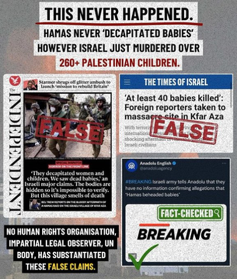 ♦ It has also been firmly refuted the lie of the “40 beheaded babies” by the Palestinian fighters, and even Israeli sources denied this lie. Many of the western media agencies unfortunately adopted this allegation and promoted it.