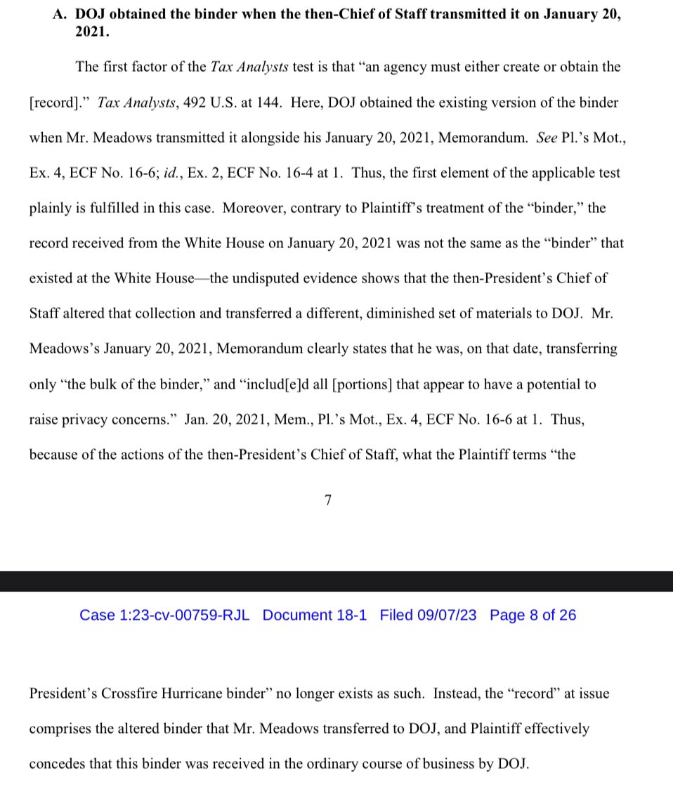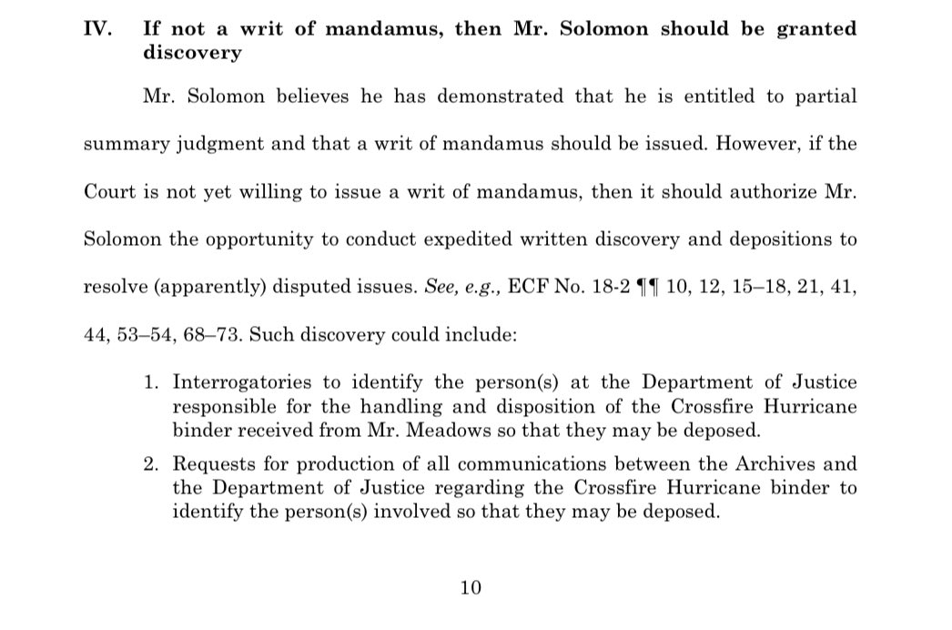 Absent a decision, we have requested the court to grant discovery for the purpose of uncovering how the DOJ and NARA handled the records from President Trump’s binder just as Biden was being sworn into office.