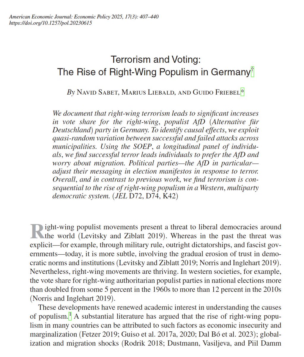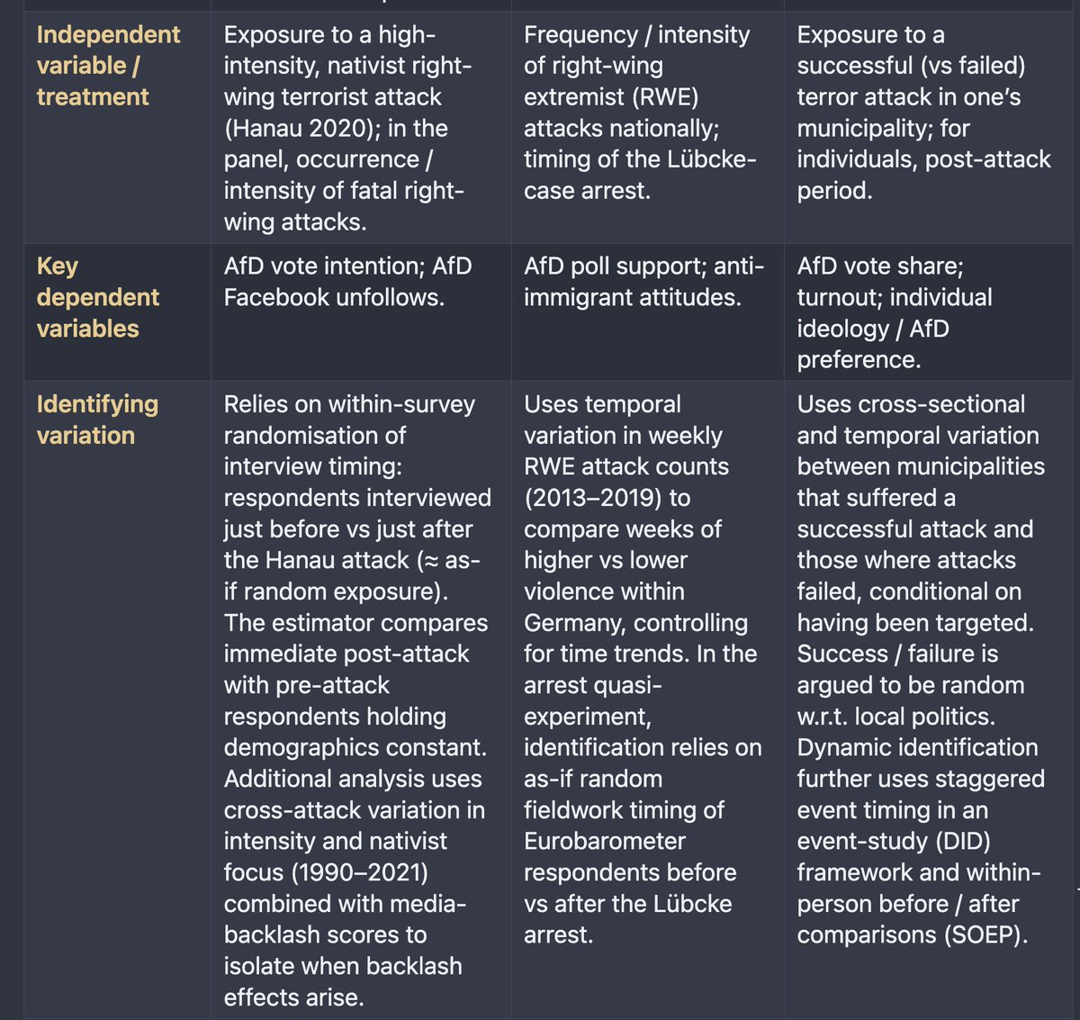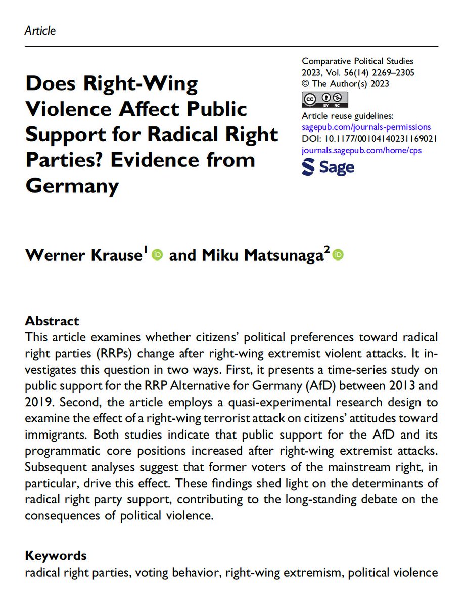 Fascinating paper, especially when read against the backdrop of these (👇) two related papers! All three study the political effects of right-wing violence in Germany, yet they find seemingly contradictory opposite results. Below my attempt to reconcile the findings.