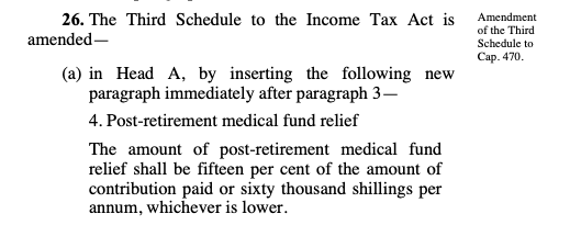 The answer lies in the amendment to the 3rd Schedule of the Income Tax Act which provides that contributors will be granted relief to the tune of 15.0% of the amount contributed or Kes 60,000 annually (Kes 5,000/month), whichever is lower