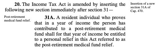 The amendment to Sec31 of the Income Tax Act providing for post-retirement medical relief is a big one! There'll be tax relief for expenses incurred toward post-retirement medical fund & the idea here is to create an incentive for preparation for sunset years' medical bills