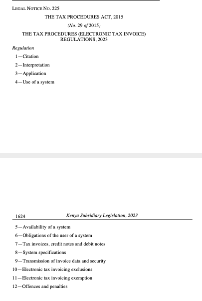The final Tax Procedures (Electronic Tax Invoice) Regulations 2023 have been gazetted. These are the regulations that guide the implementation of Finance Act 2023's amendment to Sec23A & Sec86 of the Tax Procedures Act on mandatory eTIMS onboarding