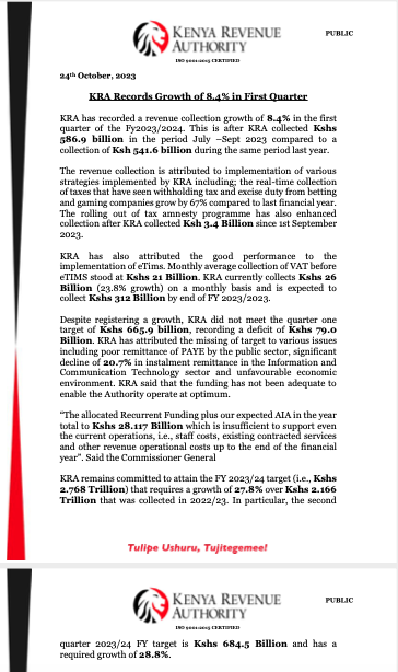 Tax revenue for Q12023/24 stood at Kes 589.6B falling short of its target by Kes 79.0 billion & that's where the headache is