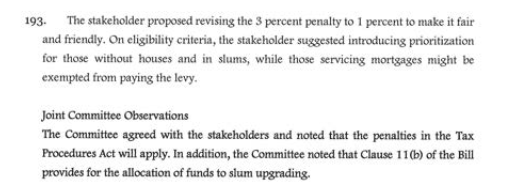 The Committee has recommended that Sec7 of the bill be amended to scale down the 3.0% penalty (of the unpaid amount) for one falling into arrears on remittance to the fund. Tax Procedures Act penalty will apply. The accrued penalties to be for slum upgrading