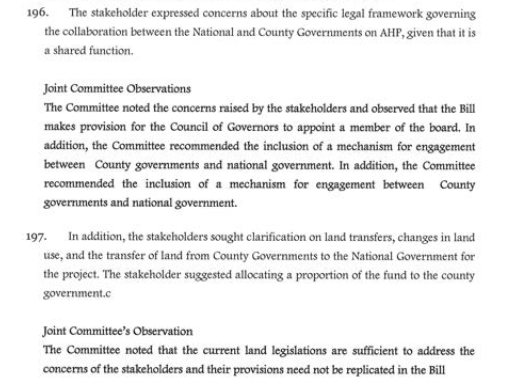 · Has thrown out concerns regarding collaboration between National & County govts. They argue the Bill provides for the Council of Governors to appoint a member to the Affordable Housing Board