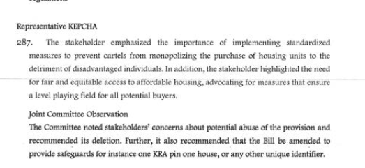 The committee proposes Sec30(2c) of the bill be amended to provide that housing units be allocated pegged on one KRA pin per house (or any other suitable unique identifier).