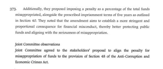 The Committee has endorsed the proposal to amend Sec40 (cii) the penalty imposed on persons who misappropriate the affordable housing levy funds from the fine not exceeding Kes 10.0M or jail term not exceeding 5 years to align with Sec48 of the Anti-Corruption Act