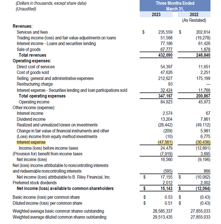 3/ $RILY interest expense +56.3% y/y to $47.6m in 1Q23 ($190.2m annual run rate for interest expense)
