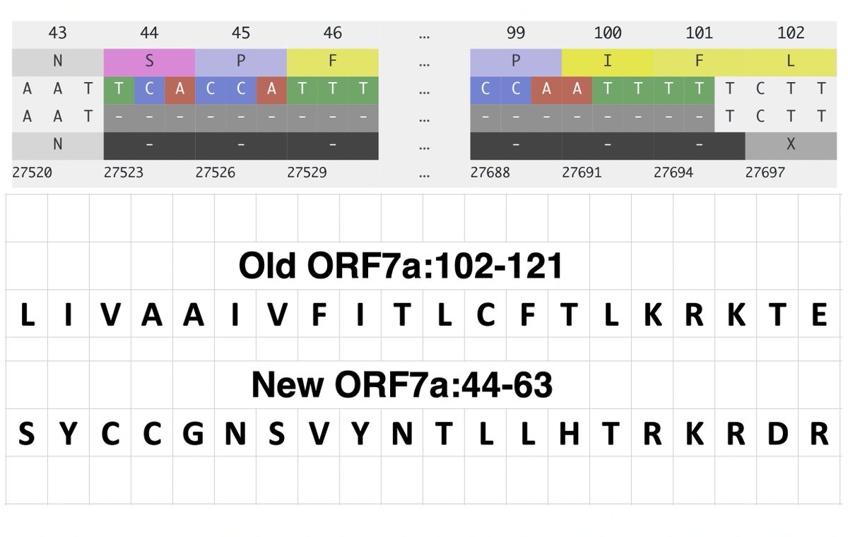 Instead of hitting a stop codon, the new frame leads seamlessly into ORF7b. The red region below is the 173-nt deletion, and the purple is the new ORF7a reading frame.