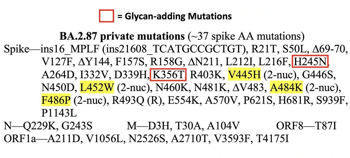 Longer 🧵 on BA.2.87. So far, it has not grown quickly or spread far geographically, so its future is murky. It could be a flash-in-the-pan that soon disappears or it could mutate to become more fit & challenge JN.1. My summary of its private mutations is below. 1/22