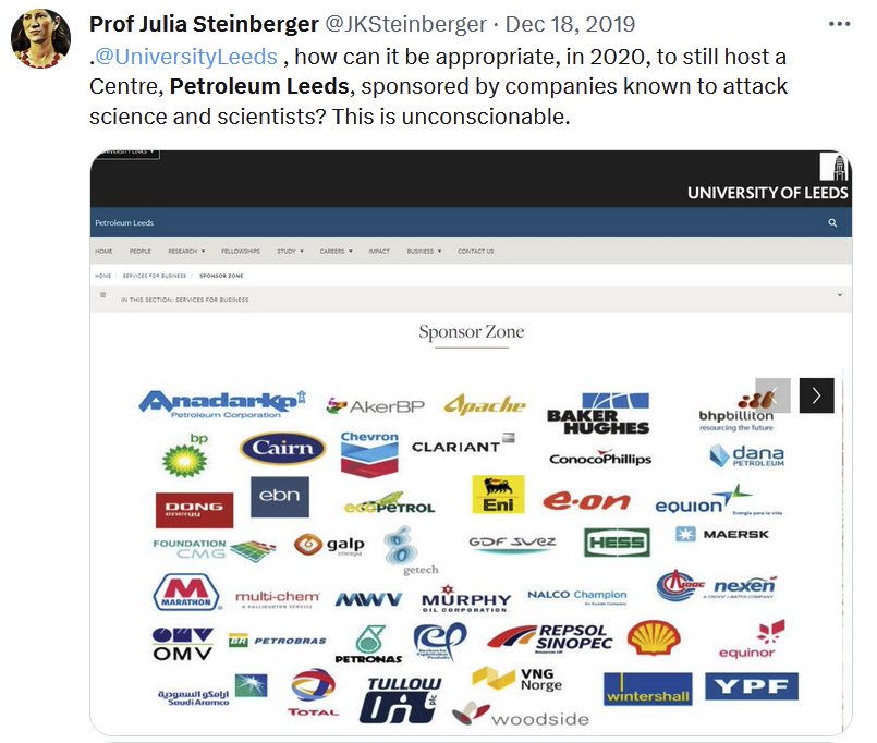 1⃣ Campaigns like fossil fuel divestment could not call out "Petroleum@Leeds", the Leeds institute funded by fossil fuel companies and advancing their interests, since it would (absolutely rightfully) bring the university into disrepute. 2/