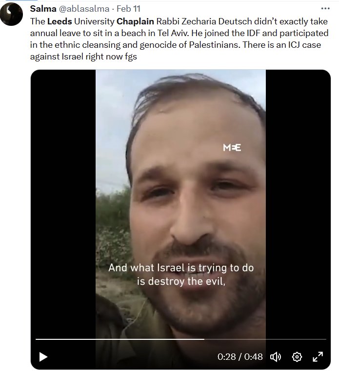 2⃣ Campaigns for Palestinian human rights, and Boycott-Divest-Sanctions could not draw attention to a Leeds Uni chaplain going to participate in ongoing genocide as a reservist for the IDF, ditto. 3/