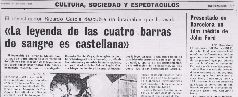 Pero no fue Martín de Riquer el que desveló que todo erá una farsa. De Riquer copió la tésis del escritor valenciano Ricardo García Moya que lo había denunciado en 1989 (11 años antes) en una información publicada en Las Provincias donde revelaba que el cuento de la "señera"