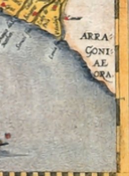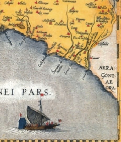 Es más, en el linde con el Mediterráneo pone "Aragoniae ora. O sea, costa de Aragón" en lo que hoy es Tarragona y hace mucho Tarraco. Cataluña no era ni condado ni Reino. Era una provincia española del reino de Aragón a finales del siglo XVI.
