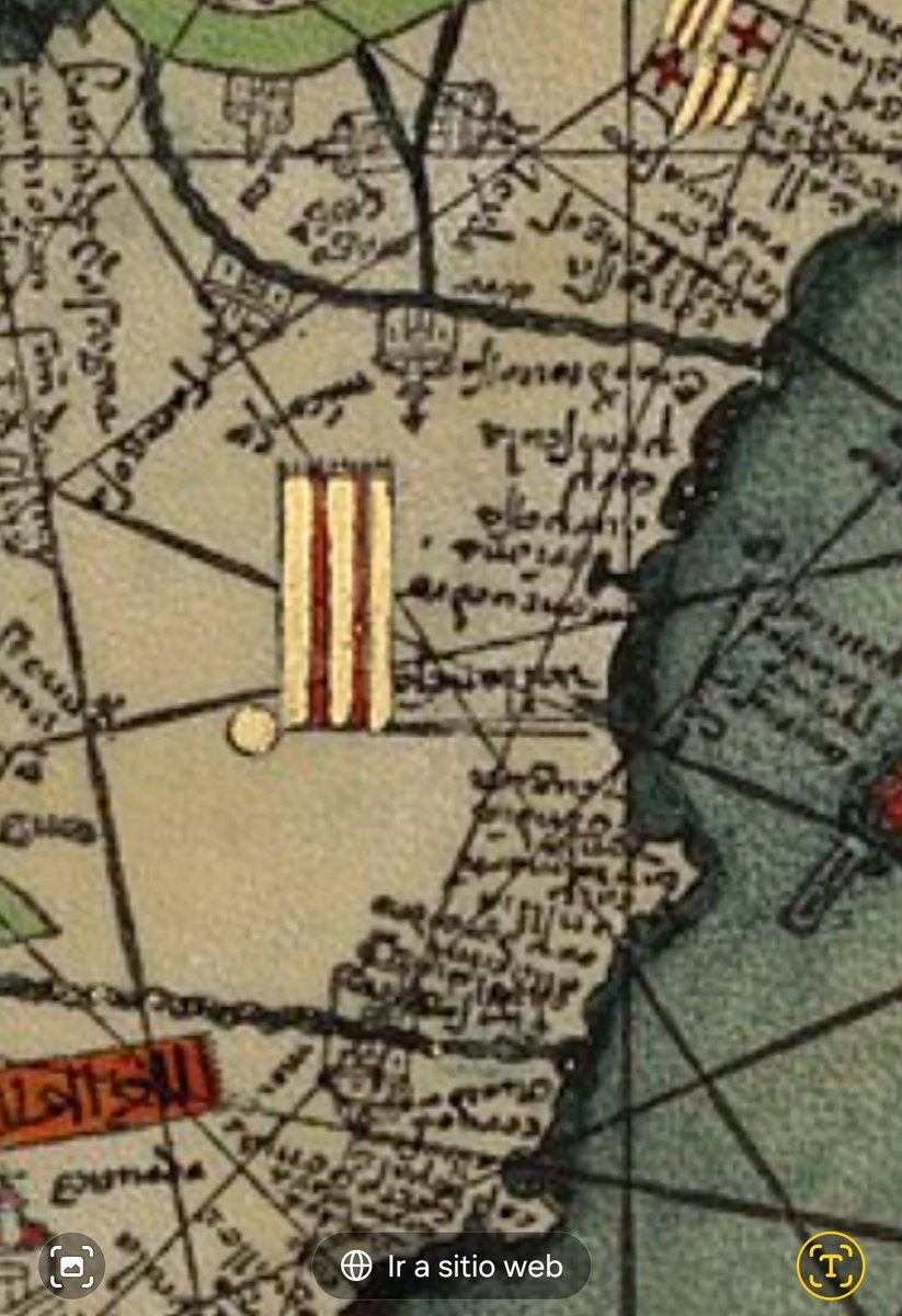 Y si os fijáis, Abraham Cresque, su autor, aún pinta sobre Valencia (1375) la bandera con la que Jaime I conquistó el Reino moro valenciano y que usó la Casa de los Aragón desde 1068 cuando Sancho Ramírez juró vasallaje al Papa de Roma y tomó como propia la bandera papal. Nada de 4 barras. (Por eso el pendón de la Conquista que enarbolan los catalanes y catalanistas es falso hasta Pedro IV el Ceremonioso.