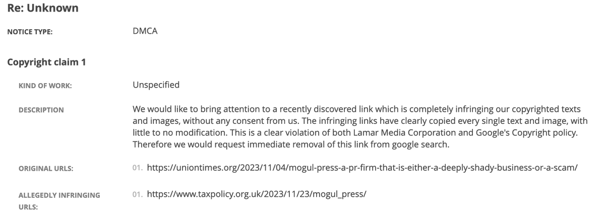 I wrote recently about a fraudulent attempt to use US copyright law to take down an article I’d written which was critical of a fake PR firm, “Mogul Press”.