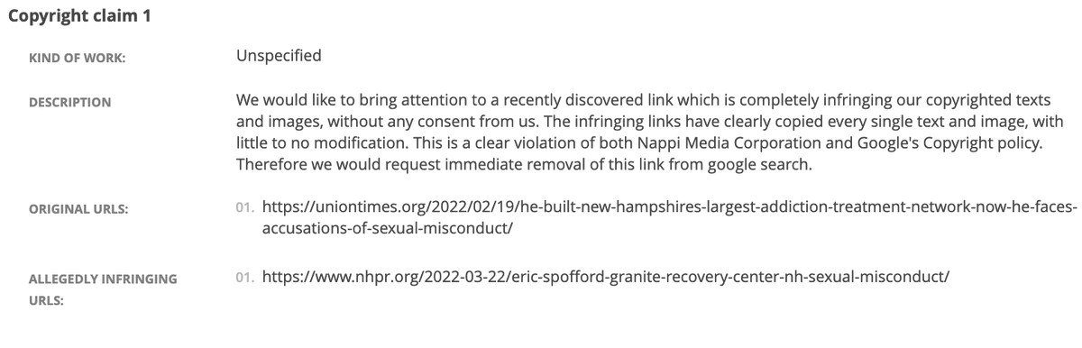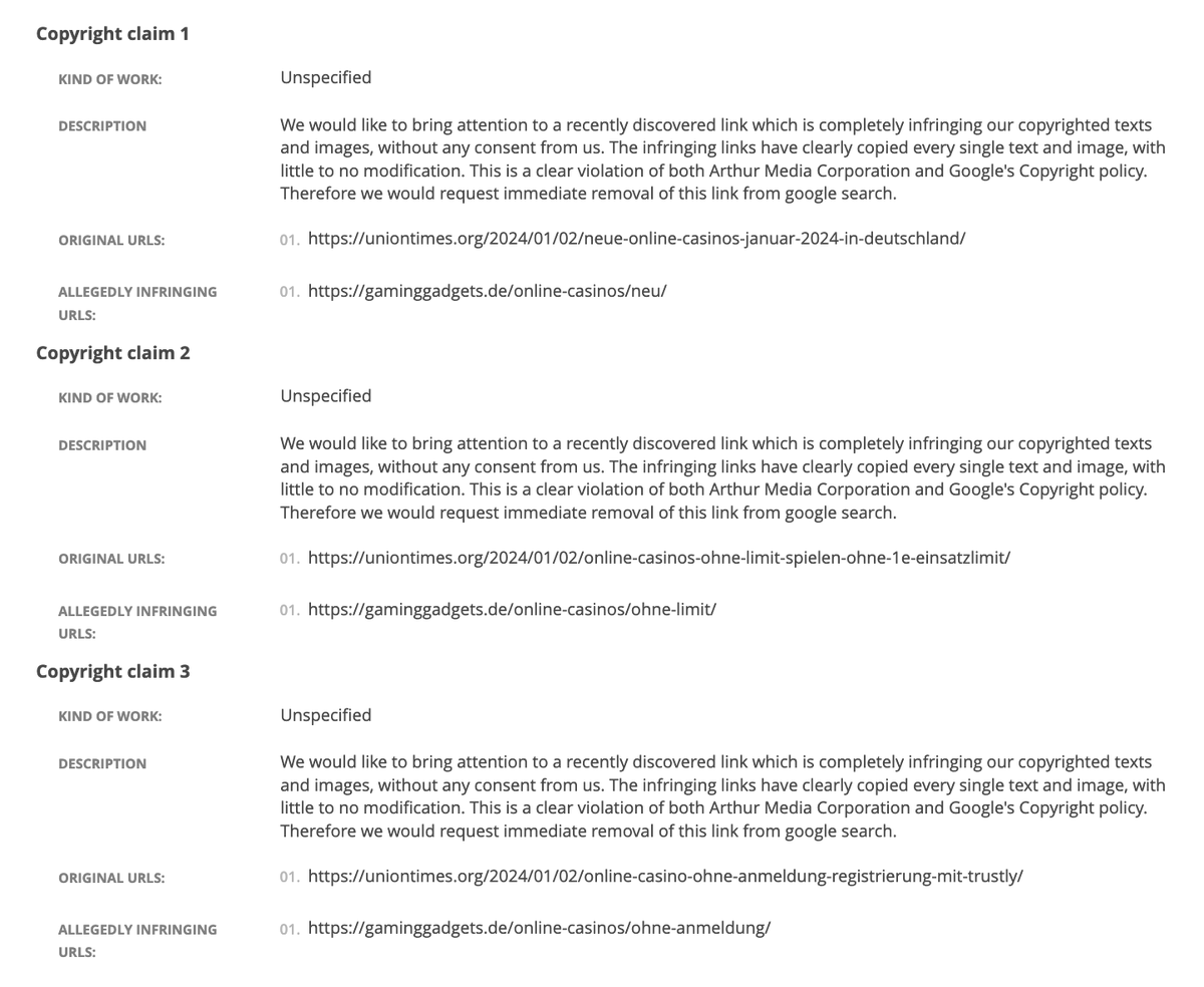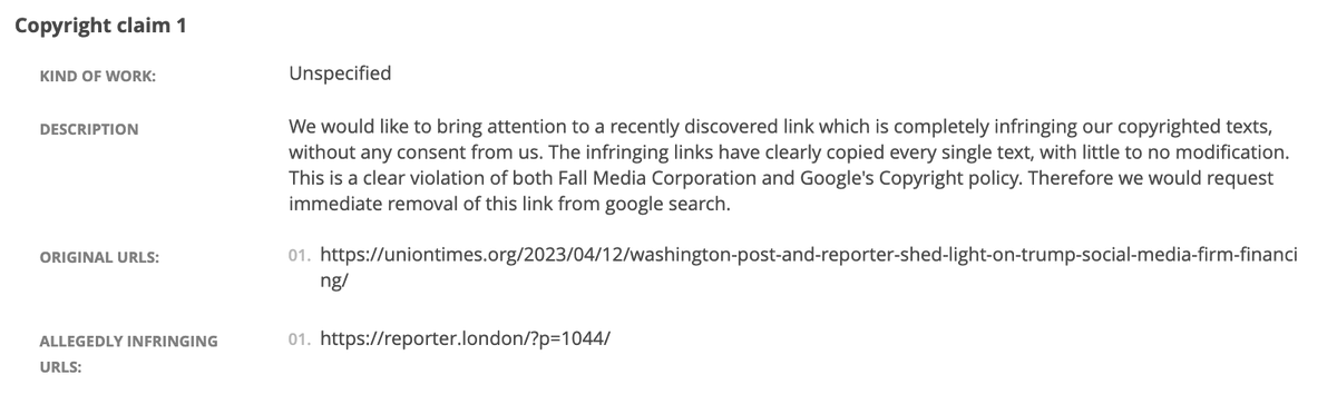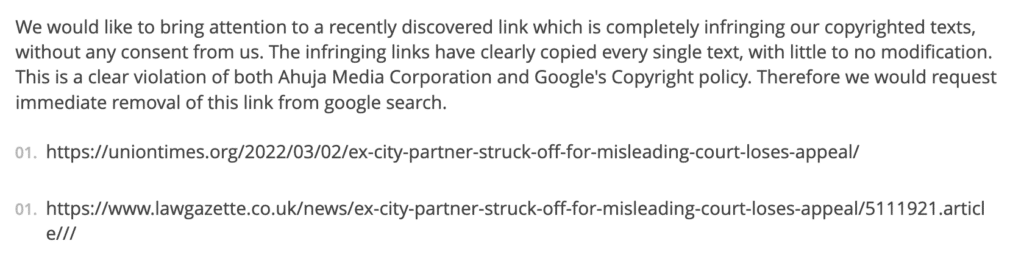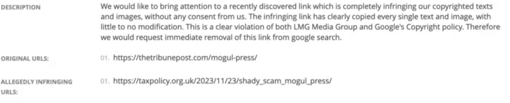 I was shocked to see how they did this – they copied my text into a fake website,1 then filed a takedown notice at Google claiming my article had copied theirs: