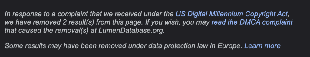 I wondered if there had been any other similar takedowns, and so searched for other occurrences of that unusual phrase. This search of the Lumen database finds 180 just from "Media Corporation" entities