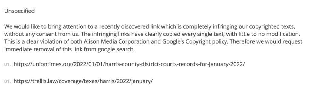 And many non-existent corporations are trying to take down Harris County Texas law reports (I don't know why):