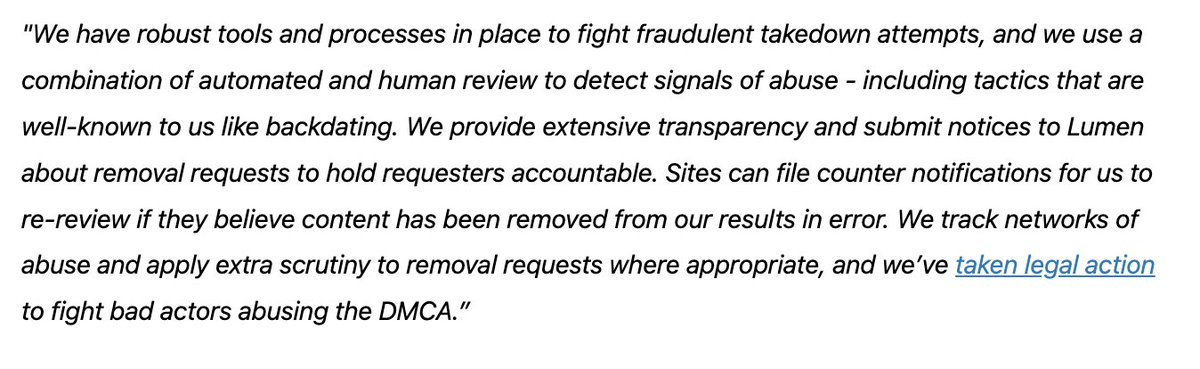 Unfortunately this doesn't seem to be working. The obvious additional step would be for Google to require ID verification for people submitting DMCA claims. It's not at all obvious why they can't do that.